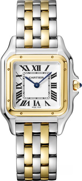 Часы Cartier Panthere de Cartier представлены в корпусе размером 37 х 27 мм из нержавеющей стали желтого золота 18к и водонепроницаемостью до 30 метров. Внутри корпуса установлен кварцевый механизм. На белом циферблате отображаются часы, минуты. Часы поставляются на браслете из нержавеющей стали и желтого золота 18к.