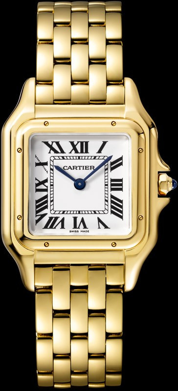 Часы Panthere de Cartier представлены в корпусе из желтого золота 18к размером 27 х 35 мм. Белый циферблат с крупными римскими цифрами, центр с минутной шкалой в виде железной дороги, которая украшает центральную область, с двумя стрелками из вороненой стали. Безель из желтого золота закреплен восемью винтами. Заводная головка из желтого золота на 3 часах украшена сапфиром кабошоном. Внутри установлен кварцевый часовой механизм. Часы поставляются на браслете из желтого золота.