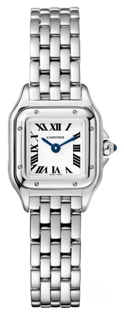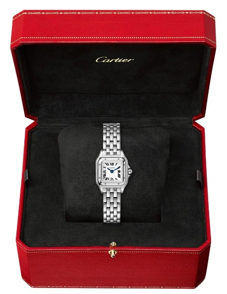 Часы Cartier Panthere de Cartier Mini представлены в корпусе из нержавеющей стали размером 25 х 21 х 6 мм и водонепроницаемостью до 30 метров. Внутри корпуса установлен кварцевый механизм. На белом циферблате отображаются часы, минуты. Часы комплектуются браслетом из нержавеющей стали.