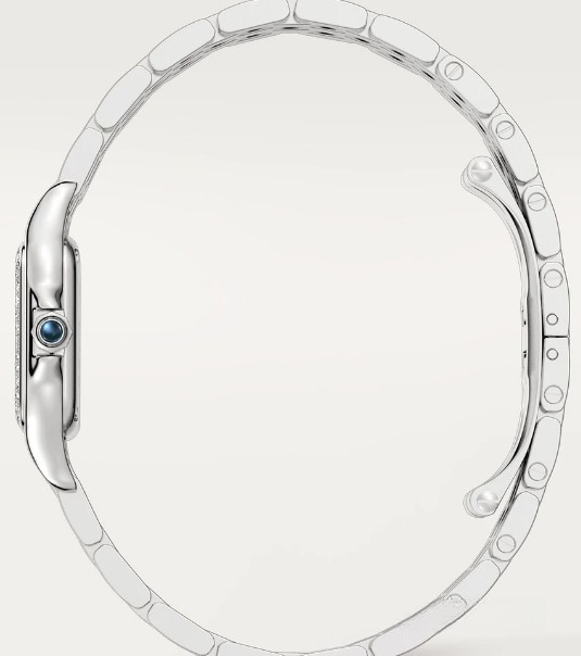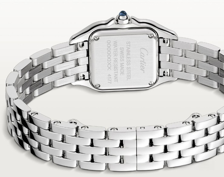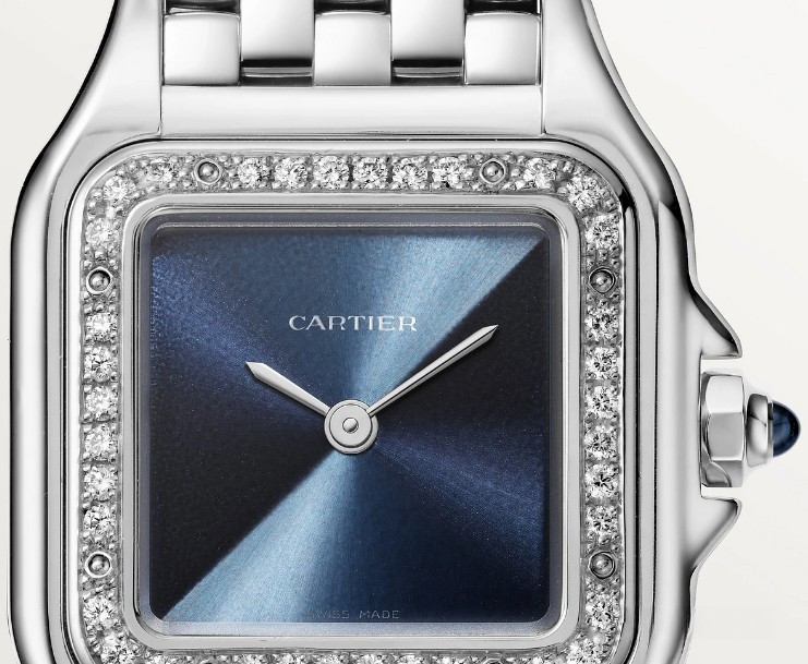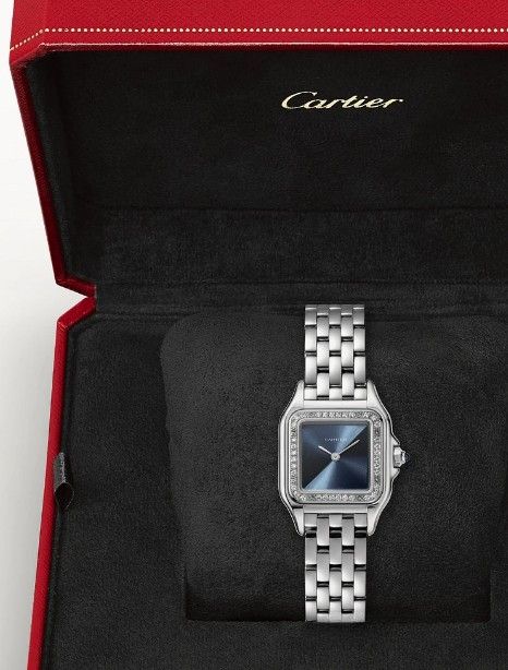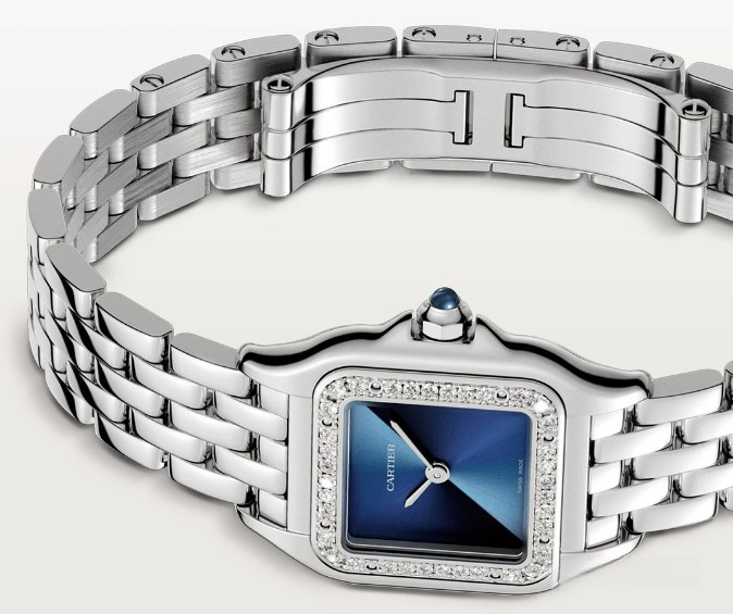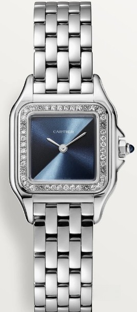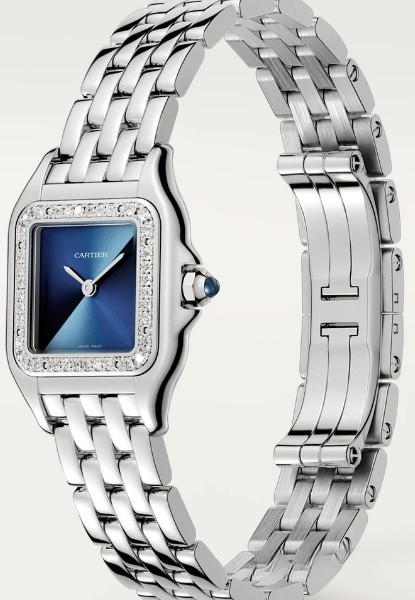 Часы Cartier Panthere de Cartier представлены в корпусе размером 22 х 30.3 х 6.05 мм из нержавеющей стали и водонепроницаемостью до 30 метров. Внутри корпуса установлен кварцевый механизм. На синем циферблате отображаются часы, минуты. Часы поставляются на браслете из нержавеющей стали. Безель из белых бриллиантов.