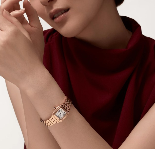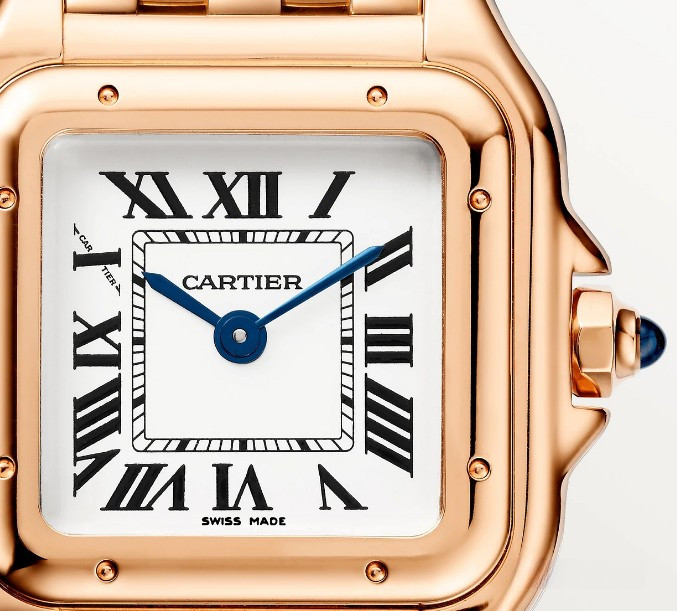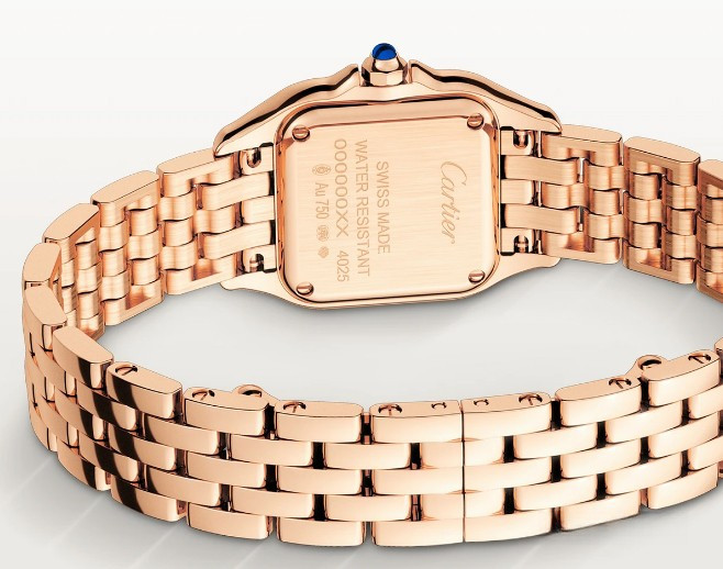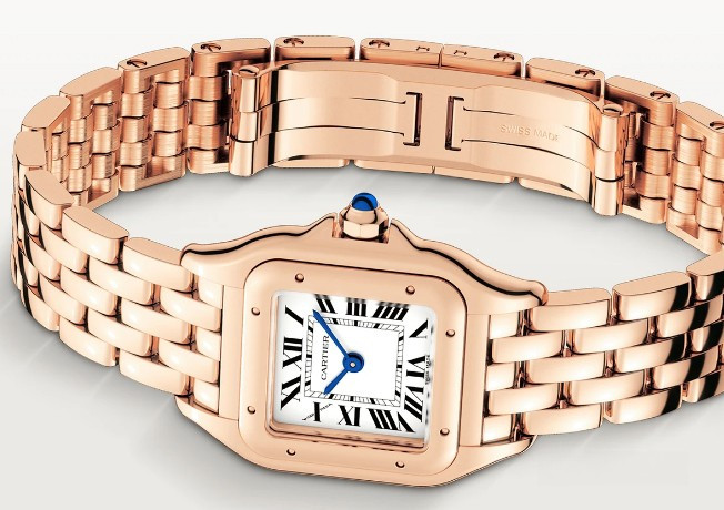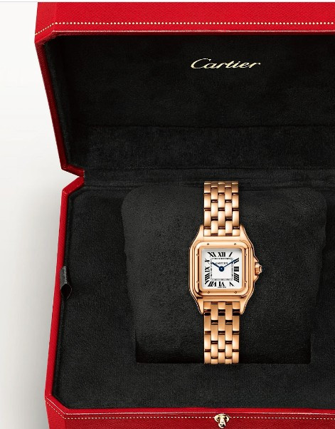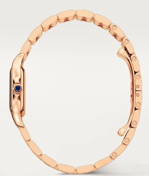 Часы Cartier Panthere de Cartier представлены в корпусе размером 23.49 х 30.3 х 6.05 мм из розового золота 18к и водонепроницаемостью до 30 метров. Внутри корпуса установлен кварцевый механизм. На белом циферблате отображаются часы, минуты. Часы поставляются на браслете из розового золота 18к.
