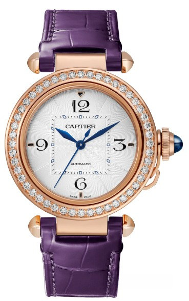 Часы Cartier Pasha de Cartier Automatic 35 mm представлены в корпусе размером 35 х 9.37 мм из розового золота 18к водонепроницаемостью 100 метров. Внутри корпуса установлен автоматический механизм, Калибр 1847 MC. На серебристом гильошированном циферблате отображаются часы, минуты, секунды. Часы поставляются на ремешке из кожи аллигатора с вставкой из розового золота 18к. В наборе сменный ремешок из кожи аллигатора. Безель из белых бриллиантов.