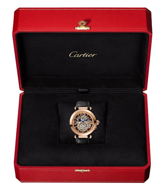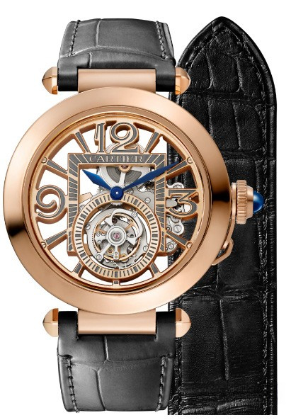 Часы Cartier Pasha de Cartier Skeleton 41 mm представлены в корпусе размером 41 х 10.45 мм из розового золота 18к водонепроницаемостью 30 метров. Внутри корпуса установлен механизм с ручным заводом, Калибр 9466 MC, обладающий запасом хода 50 часов. На золотистом скелетированном циферблате отображаются часы, минуты, клеть турбийона. Часы поставляются на ремешке из кожи аллигатора с вставкой из розового золота 18к. В наборе сменный ремешок из кожи аллигатора.