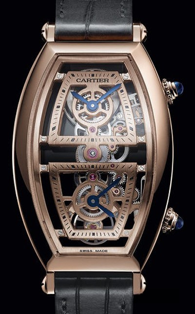 Часы Cartier Prive Tonneau XL Skeleton Dual Time представлены в корпусе из розового золота 18к размером 52.4 х 29.8 х 11.9 мм. Внутри корпуса установлен механизм с ручным заводом, Калибр 9919 MC, обладающий запасом хода 60 часов. На золотистом скелетированном циферблате отображаются часы, минуты, два часовых пояса. Часы поставляются на ремешке из кожи аллигатора с вставкой из розового золота 18к. Водонепроницаемость корпуса составляет 30 метров. Часы выпущены ограниченной серией 100 шт.