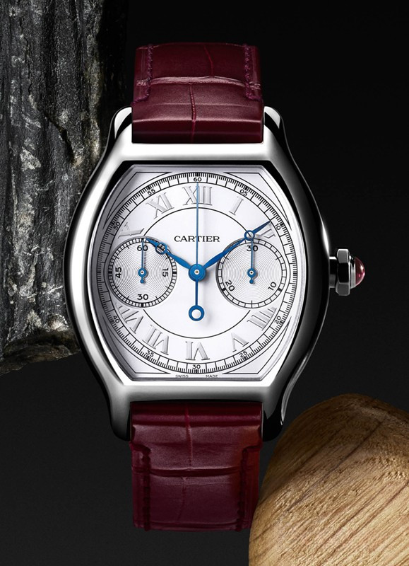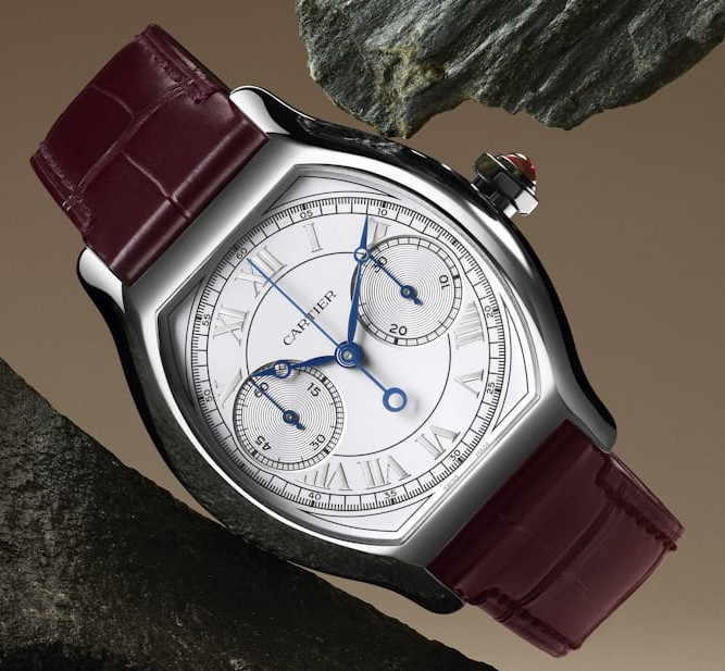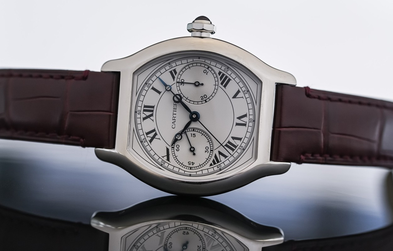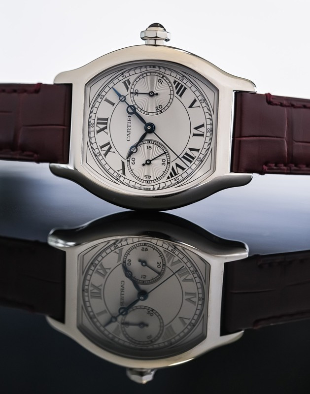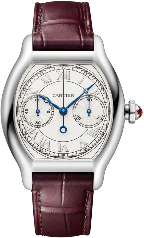 Часы Cartier Prive Tortue Monopoussoir представлены в корпусе размером 43.7 х 34.8 х 10.2 мм из платины 950 водонепроницаемостью 30 метров. Внутри корпуса установлен механизм с ручным заводом, Калибр 1928 MC, обладающий запасом хода 42 часа. На серебристом циферблате отображаются часы, минуты, секунды, накопители хронографа. Часы поставляются на ремешке из кожи аллигатора с платиновой застежкой. Серия ограничена - 200 шт.