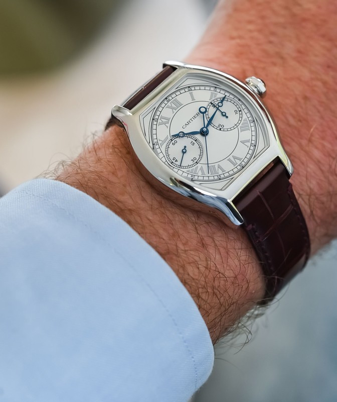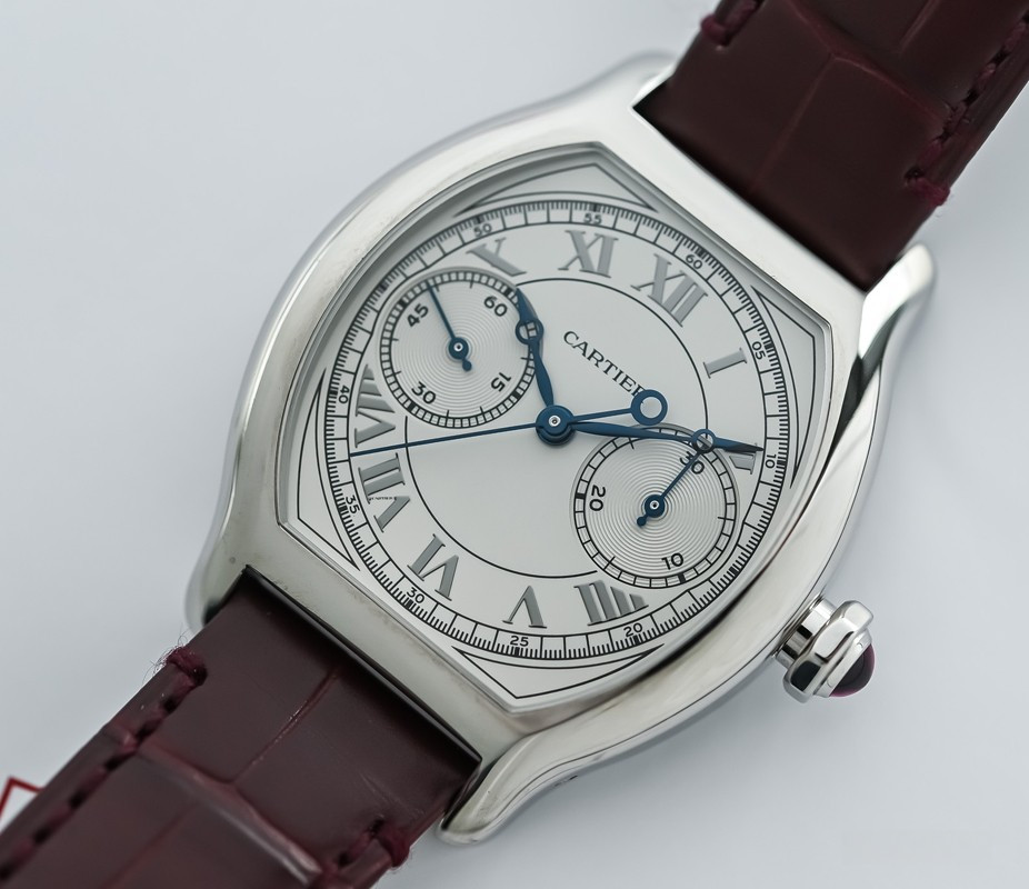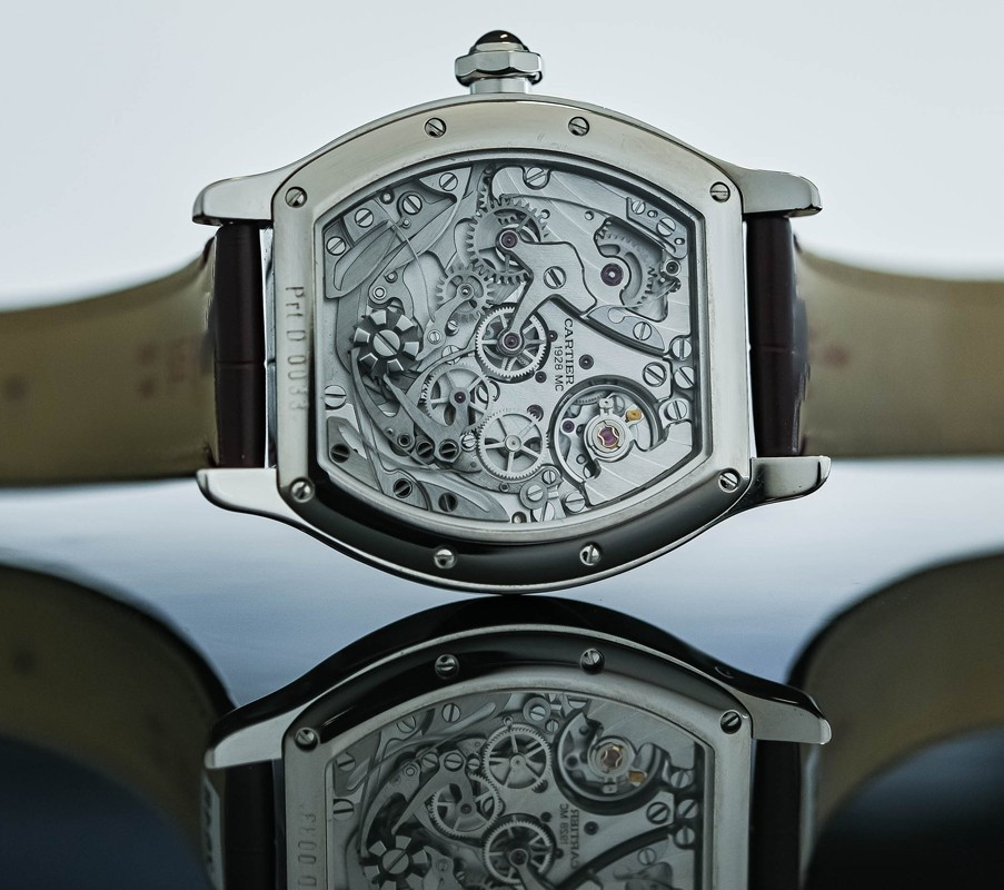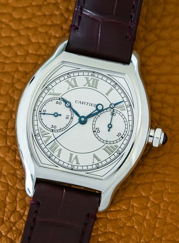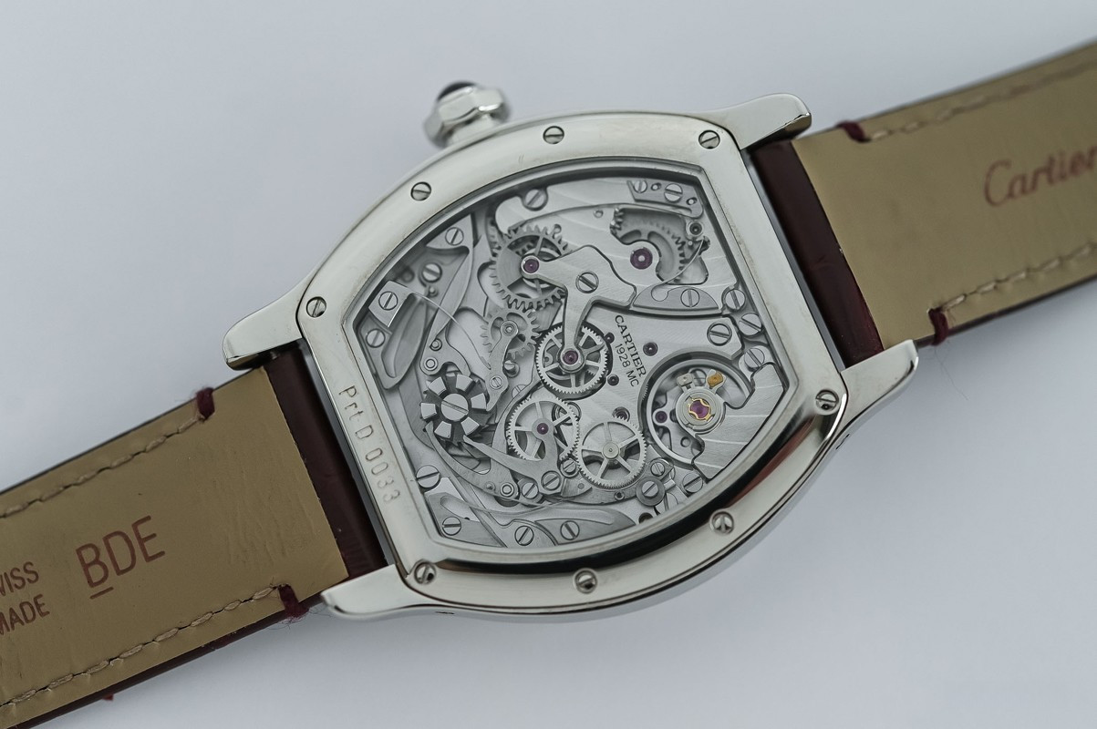 Часы Cartier Prive Tortue Monopoussoir представлены в корпусе размером 43.7 х 34.8 х 10.2 мм из платины 950 водонепроницаемостью 30 метров. Внутри корпуса установлен механизм с ручным заводом, Калибр 1928 MC, обладающий запасом хода 42 часа. На серебристом циферблате отображаются часы, минуты, секунды, накопители хронографа. Часы поставляются на ремешке из кожи аллигатора с платиновой застежкой. Серия ограничена - 200 шт.