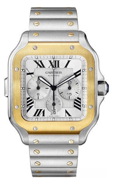 Часы Cartier Santos Chronograph представлены в корпусе из нержавеющей стали и желтого золота 18к размером 43.3 х 51.3 х 12.5 мм и водонепроницаемостью 100 м. Внутри корпуса установлен автоматический механизм, Калибр 1904-CH MC, обладающий запасом хода 48 часов. На серебристом циферблате отображаются часы, минуты, секунды и дата, накопители хронографа. Часы комплектуются браслетом из нержавеющей стали.