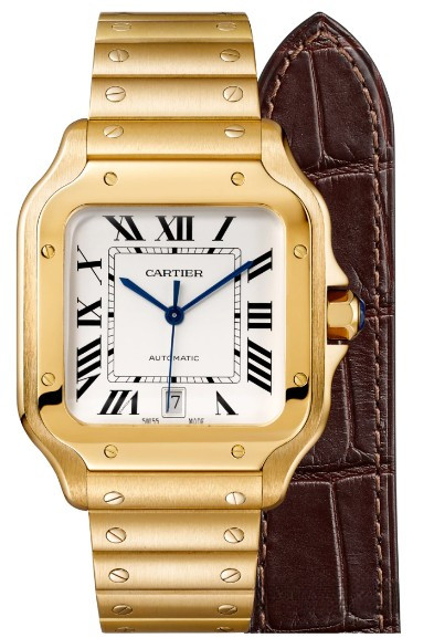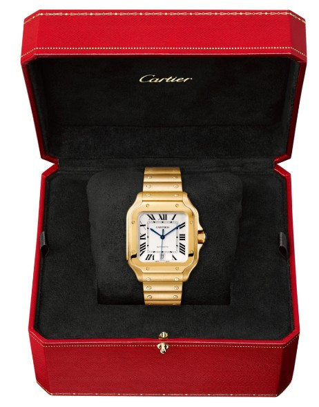 Часы Cartier Santos de Cartier Large представлены в корпусе из желтого золота 18к размером 39.8 x 9.08 мм и водонепроницаемостью 100 м. Внутри корпуса установлен автоматический механизм, Калибр 1847 MC, обладающий запасом хода 42 часа. На белом циферблате отображаются часы, минуты, секунды и дата. Часы комплектуются браслетом из желтого золота 18к. В наборе дополнительный сменный ремешок из кожи аллигатора.