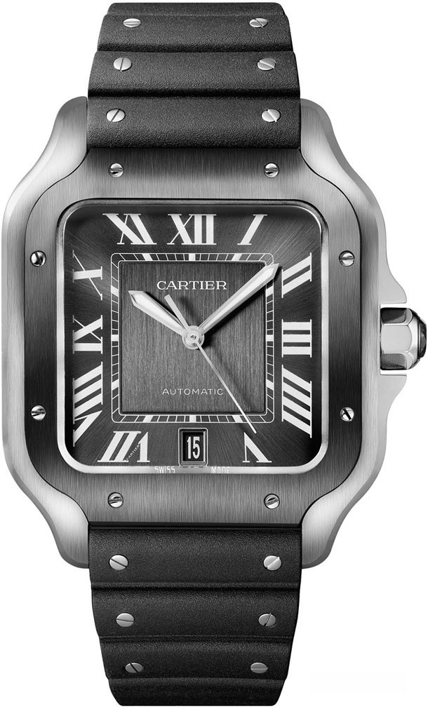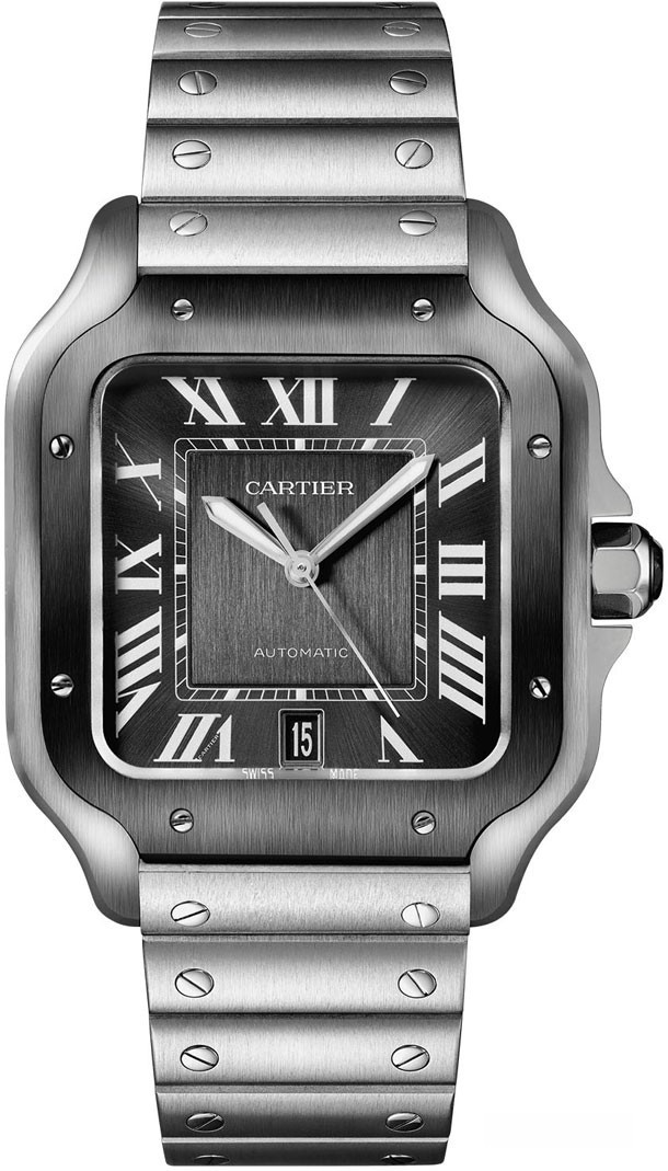 Часы Cartier Santos de Cartier Large представлены в корпусе из нержавеющей стали с покрытием ADLC размером 47.5 х 39.8 x 9.38 мм и водонепроницаемостью 100 м. Внутри корпуса установлен автоматический механизм, Калибр 1847 MC, обладающий запасом хода 42 часа. На сером циферблате отображаются часы, минуты, секунды и дата. Часы комплектуются браслетом из нержавеющей стали.