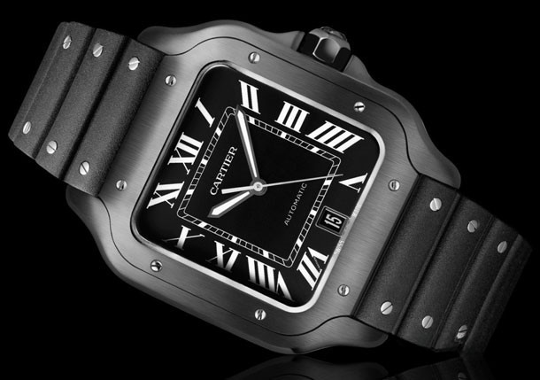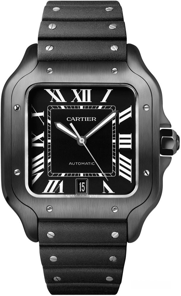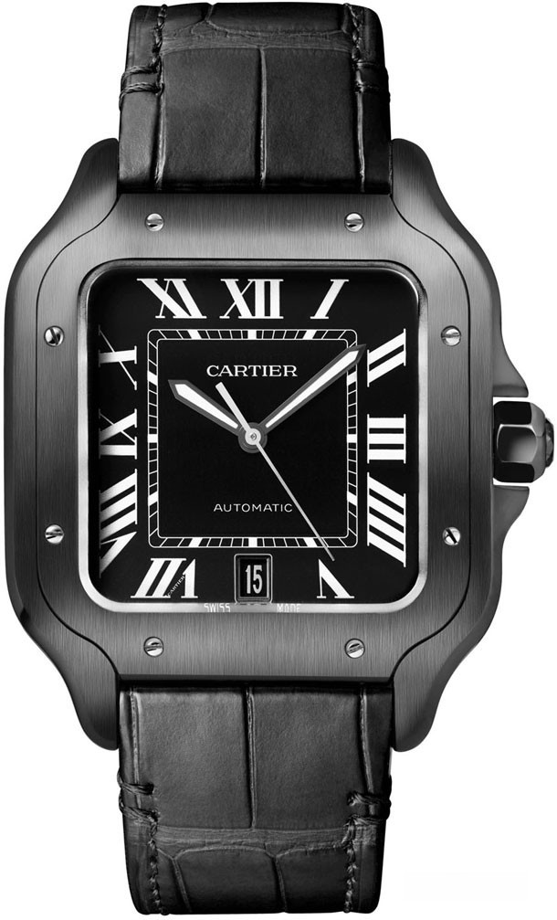 Часы Cartier Santos de Cartier Large представлены в корпусе из нержавеющей стали с покрытием ADLC размером 47.5 х 39.8 x 9.38 мм и водонепроницаемостью 100 м. Внутри корпуса установлен автоматический механизм, Калибр 1847 MC, обладающий запасом хода 42 часа. На черном циферблате отображаются часы, минуты, секунды и дата. Часы комплектуются ремешком из кожи аллигатора с вставкой из нержавеющей стали.