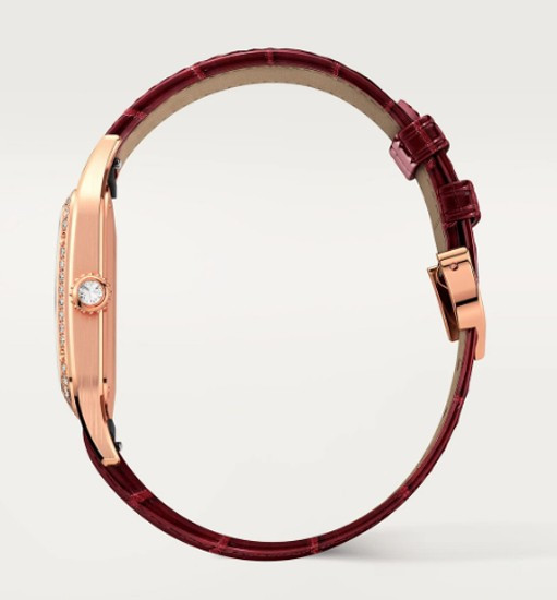 Часы Cartier Santos-Dumont Large представлены в корпусе из розового золота 18к размером 43.5 x 31.4 х 7.3 мм и водонепроницаемостью до 30 метров. Внутри корпуса установлен кварцевый механизм. На серебристом циферблате отображаются часы, минуты. Часы комплектуются ремешком из кожи аллигатора с золотой застежкой. Безель из белых бриллиантов.