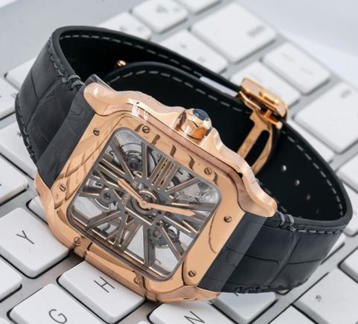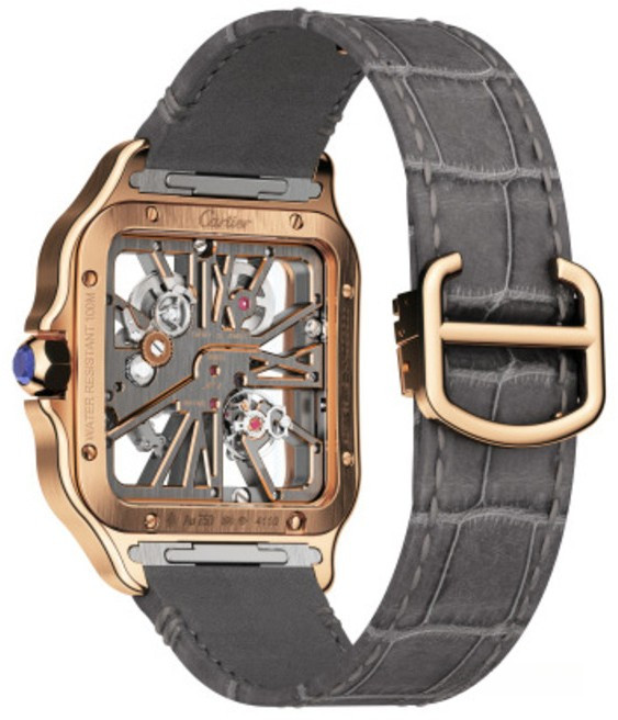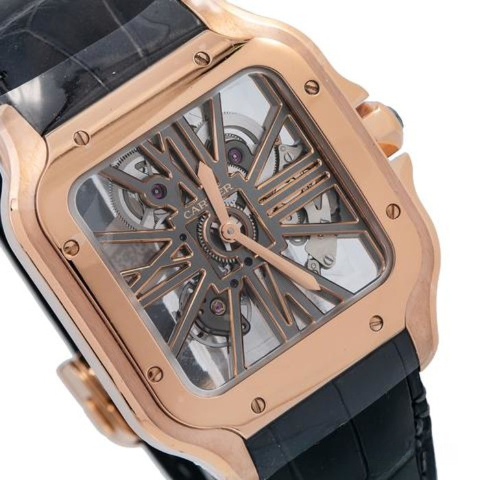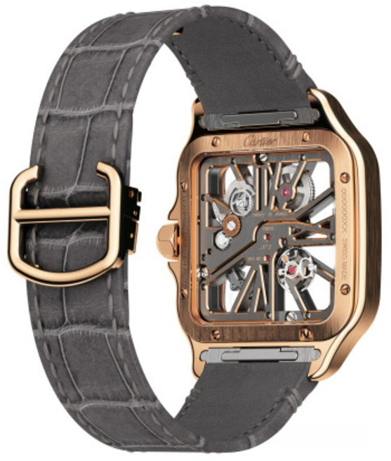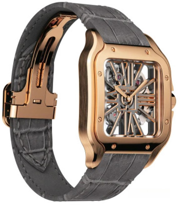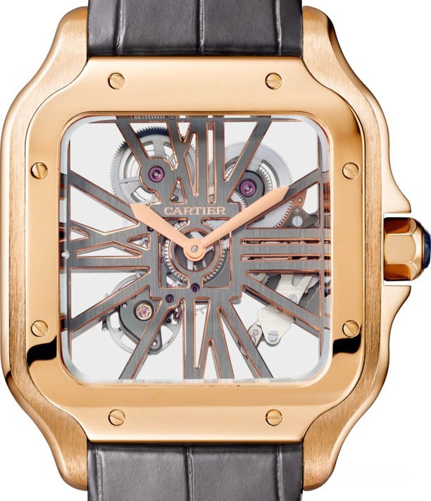 Компания Cartier представила часы Santos de Cartier Skeleton. Новинка обладает размером 28 х 28 мм и изготовлена из розового золота 18к. Мосты в форме римских цифр. Безель плавно интегрируется с линиями корпуса и ремешком из кожи аллигатора сзолотой застежкой. Механизм с ручным заводом, Калибр 9619 MC обладает балансовой частотой 28 800 полуколебаний в час, обеспечивая запас хода 72 часа.