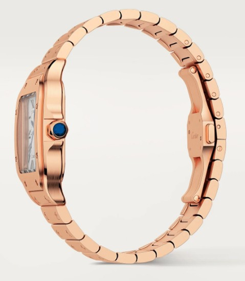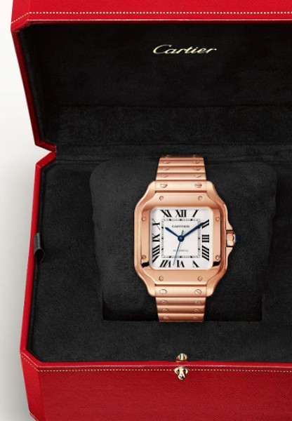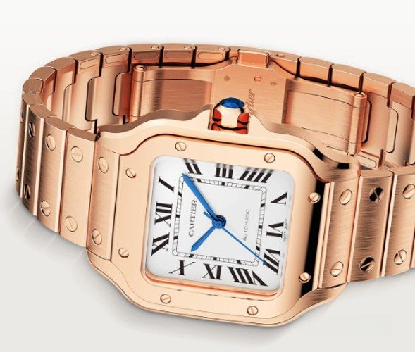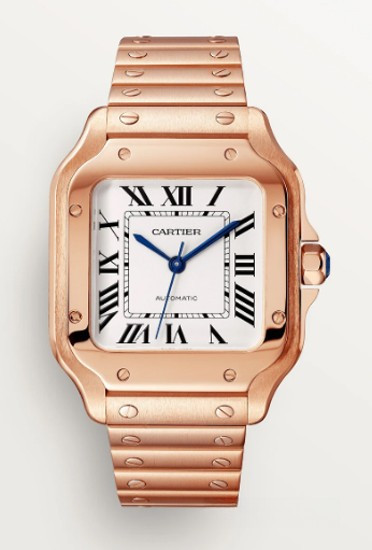Часы Cartier Santos de Cartier Santos Medium 35 mm представлены в корпусе из розового золота 18к. Внутри корпуса установлен автоматический механизм, Калибр 1847 MC. На белом циферблате отображаются часы, минуты, секунды. Часы комплектуются золотым браслетом.