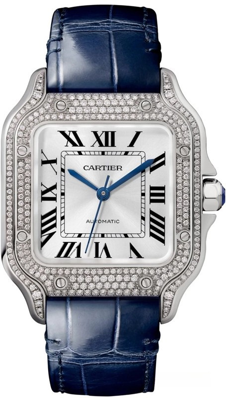 Часы Cartier Santos de Cartier Santos Medium 35 mm представлены в корпусе из белого золота 18к. Внутри корпуса установлен автоматический механизм, Калибр 1847 MC. На серебристом циферблате отображаются часы, минуты, секунды. Часы комплектуются ремешком из кожи аллигатора с золотой застежкой. Корпус инкрустирован белыми бриллиантами.