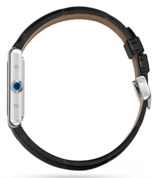 Часы Cartier Tank Must Small Quartz представлены в корпусе из нержавеющей стали размером 29.5 x 22 х 6.6 мм и водонепроницаемостью 30 метров. Внутри корпуса установлен кварцевый механизм. На черном циферблате отображаются часы, минуты. Часы поставляются на ремешке из кожи аллигатора с застежкой из нержавеющей стали.