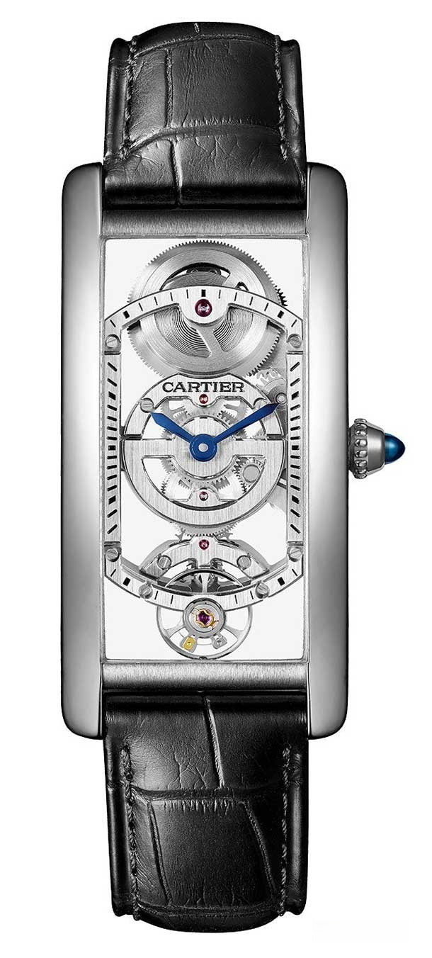 Часы Cartier Tank Cintree Skeleton представлены в корпусе из платины, корпус не обладает водостойкостью. Внутри корпуса установлен механизм с ручным заводом, Калибр 9917 MC с запасом хода 60 часов. На скелетированном циферблате отображаются часы, минуты. Часы комплектуются ремешком из кожи аллигатора с вставкой из платины.