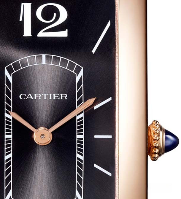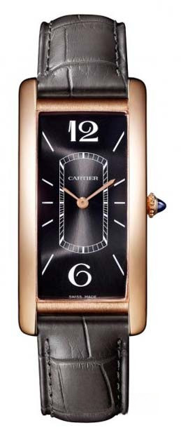 Часы Cartier Tank Cintree выпущены в корпусе из розового золота 18к размером 23 х 46.3 х 7.2 мм и водонепроницаемостью 30 м. Внутри корпуса установлен механизм с ручным заводом. На черном циферблате отображаются часы, минуты. Часы комплектуются ремешком из кожи аллигатора с вставкой из розового золота 18к.
