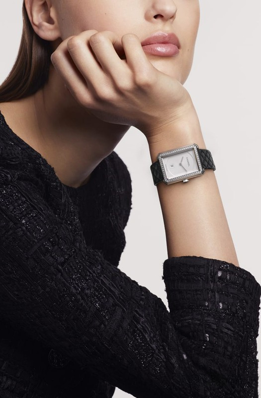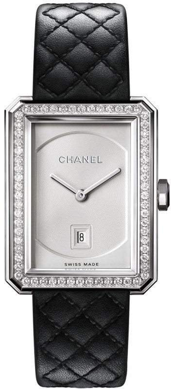 Часы Chanel Boy Friend представлены в корпусе из нержавеющей стали размером 26.7 x 34.6 x 7.3 мм водонепроницаемостью 30 метров. Внутри корпуса установлен кварцевый механизм. На серебристом циферблате отображаются часы, минуты, дата. Часы поставляются на кожаном ремешке с вставкой из нержавеющей стали. Безель из белых бриллиантов.