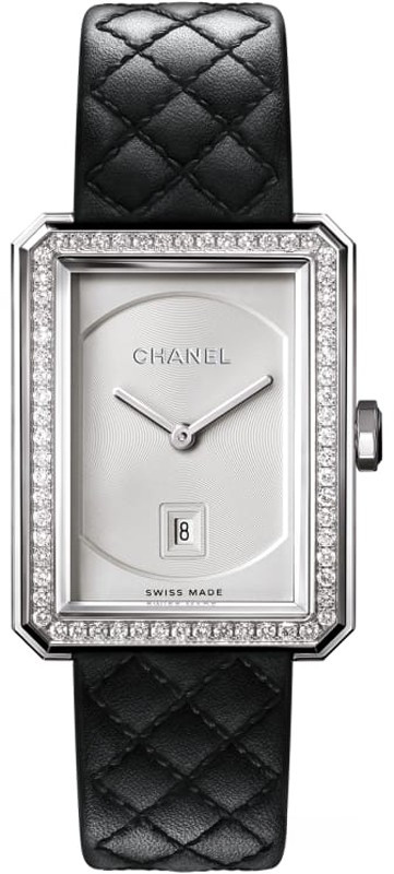 Часы Chanel Boy Friend представлены в корпусе из белого золота 18к размером 26.7 x 34.6 x 7.3 мм водонепроницаемостью 30 метров. Внутри корпуса установлен кварцевый механизм. На серебристом циферблате отображаются часы, минуты, дата. Часы поставляются на кожаном ремешке с вставкой из белого золота 18к. Безель из белых бриллиантов.