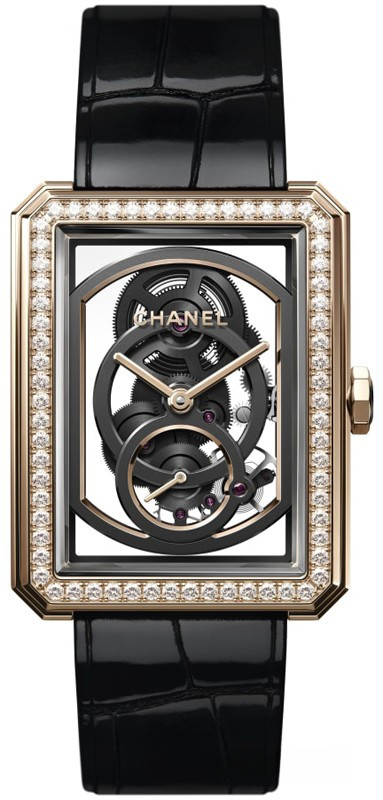 Часы Boy Friend представлены в корпусе из розового золота 18к размером 37 x 28.6 x 8.4 мм. Циферблат черный скелетированный. Кабошон из черной шпинели. Часы поставляются на ремешке из кожи аллигатора с вставкой из розового золота 18к. Внутри корпуса установлен механизм с ручным заводом. Водонепроницаемость 30 м. Безель из белых бриллиантов.