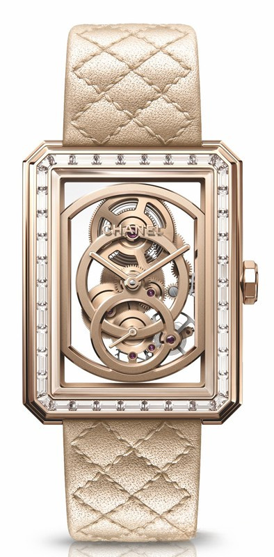 Часы Boy Friend представлены в корпусе из розового золота 18к размером 37 x 28.6 x 8.4 мм. Циферблат золотистый скелетированный. Кабошон из черной шпинели. Часы поставляются на кожаном ремешке с вставкой из розового золота 18к. Внутри корпуса установлен механизм с ручным заводом. Водонепроницаемость 30 м. Безель из белых багетных бриллиантов.