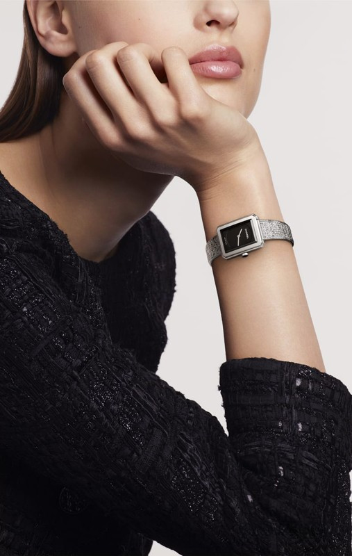 Часы Boy Friend H4876. Корпус из нержавеющей стали. Черный циферблат с эффектом гильоше. Стальная заводная коронка и кабошон из шпинели черного цвета. Браслет из нержавеющей стали с мотивом "твид". Высокоточный кварцевый механизм. Водонепроницаемость 30 м. Размер 27.9 x 21.5 x 6.2 мм.
