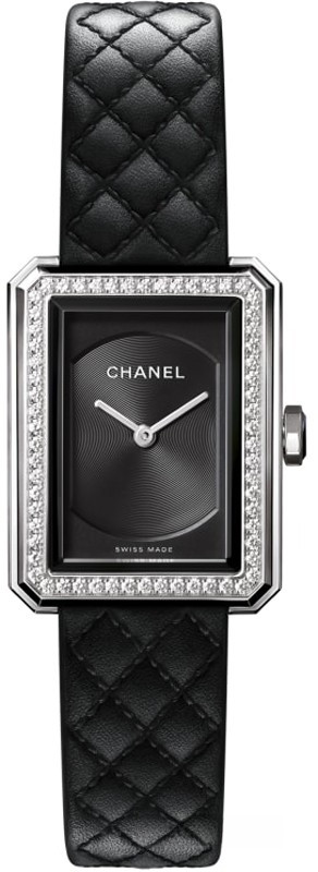 Часы Chanel Boy Friend представлены в корпусе из нержавеющей стали размером 27.9 x 21.5 x 6.2 мм водонепроницаемостью 30 метровю Внутри корпуса установлен кварцевый механизм. На черном циферблате отображаются часы и минуты. Часы поставляются на кожаном ремешке с вставкой из нержавеющей стали. Безель из белых бриллиантов.