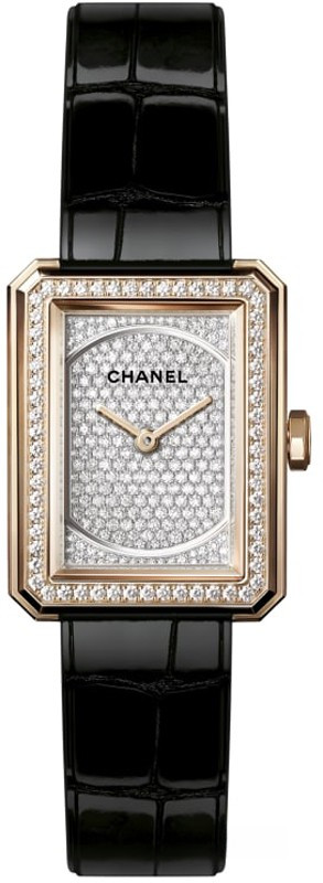 Часы Chanel Boy Friend представлены в корпусе из розового золота 18к размером 27.9 x 21.5 x 6.2 мм водонепроницаемостью 30 метровю Внутри корпуса установлен кварцевый механизм. На циферблате с белыми бриллиантами отображаются часы и минуты. Часы поставляются на кожаном ремешке с вставкой из розового золота 18к. Безель из белых бриллиантов.