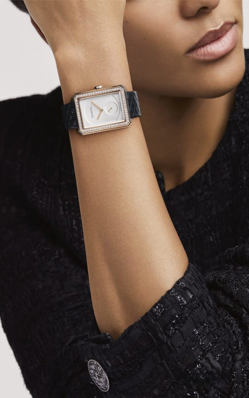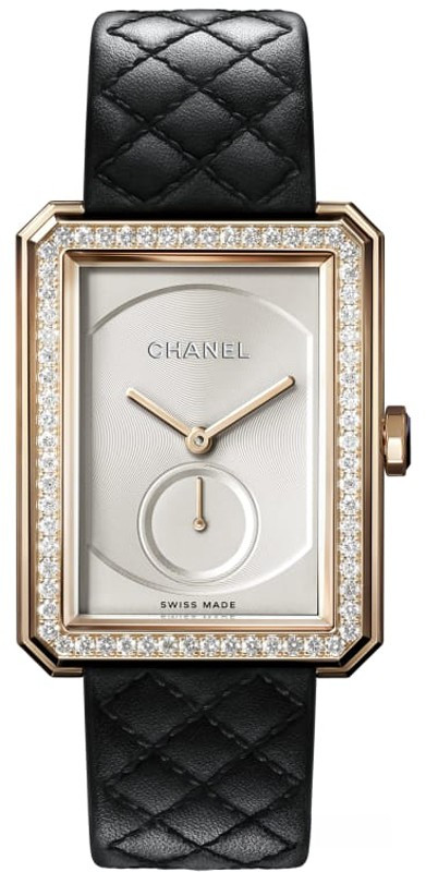 Часы Chanel Boy Friend представлены в корпусе из розового золота 18к размером 28.6 x 37 x 7.7 мм водонепроницаемостью 30 метров. Внутри корпуса установлен механизм с ручным заводом. На серебристом гильошированном циферблате отображаются часы, минуты, секунды. Часы поставляются на кожаном ремешке с вставкой из розового золота 18к. Безель из белых бриллиантов.
