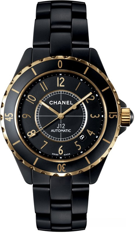 Часы Chanel J12 выпущены в корпусе из керамики и желтого золота 18к размером 42 мм с водонепроницаемостью 50 м. Внутри корпуса установлен автоматический механизм. Запас хода 60 часов. На черном циферблате отображаются часы, минуты, секунды, дата. Часы комплектуются браслетом из керамики.