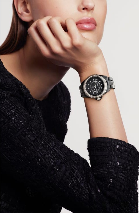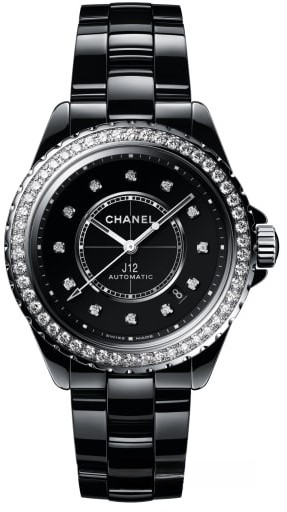 Часы работают на базе механического Калибра с автоподзаводом. Они отображают часы, минуты, секунды и дату. Запас хода составляет 42 часа. Корпус и браслет выполнены из черной высокотехнологичной керамики - очень стойкого к механическим контактным повреждениям материала. Завершает браслет тройная раскладывающаяся застежка, разработанная из стали. Циферблат черный с 12-ю белыми бриллиантами. Безель из белых бриллиантов.