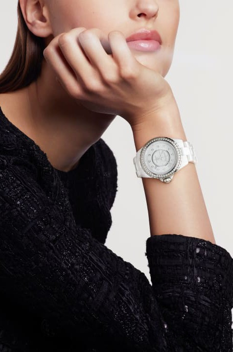Часы работают на базе механического Калибра с автоподзаводом. Они отображают часы, минуты, секунды и дату. Запас хода составляет 42 часа. Корпус и браслет выполнены из белой высокотехнологичной керамики - очень стойкого к механическим контактным повреждениям материала. Завершает браслет тройная раскладывающаяся застежка, разработанная из стали. Циферблат белый с 12-ю белыми бриллиантами. Безель из белых бриллиантов.