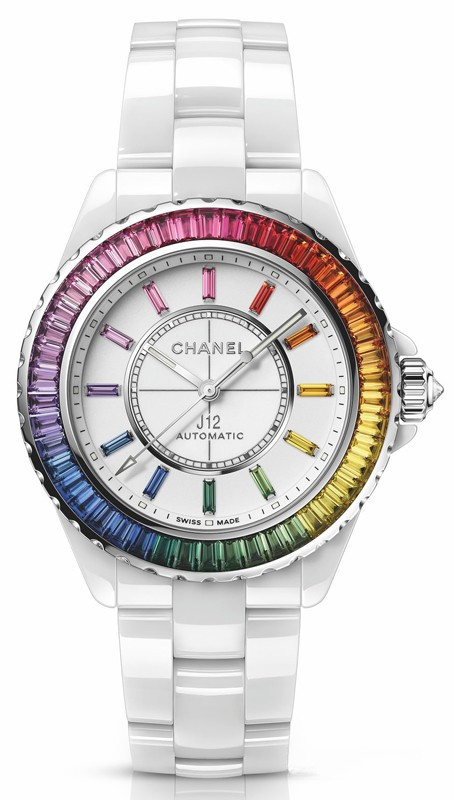 Часы Chanel J12 Electro Dream представлены в корпусе из керамики размером 38 мм водонепроницаемостью 50 метров. Внутри корпуса находится автоматический механизм, обладающий запасом хода 70 часов. На белом циферблате с 12-ю разноцветными багетными сапфирами отображаются часы, минуты, секунды. Часы поставляются на керамическом браслете. Безель из разноцветных багетных сапфиров, серия ограничена (55 шт.)