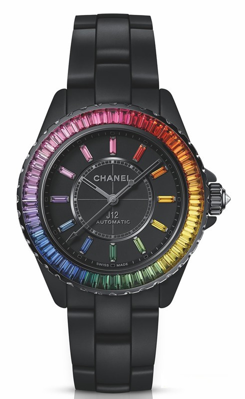 Часы Chanel J12 Electro Dream представлены в корпусе из керамики размером 38 мм водонепроницаемостью 50 метров. Внутри корпуса находится автоматический механизм, обладающий запасом хода 70 часов. На черном циферблате с 12-ю разноцветными багетными сапфирами отображаются часы, минуты, секунды. Часы поставляются на керамическом браслете. Безель из разноцветных багетных сапфиров, серия ограничена (55 шт.)