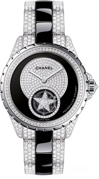 Chanel J12 Flying Tourbillon - это самые элегантные часы с турбийоном, изображающие комету из бриллиантов. Поверх золотого корпуса установлен безель, инкрустированный 74 бриллиантами круглой огранки. Турбийон стилизован кометой, усыпанной бриллиантами круглой огранки. Этот турбийон лишен верхнего моста и является результатом тесного сотрудничества между Chanel и швейцарской мануфактурой Renaud & Papi (APRP SA). J12 Flying Tourbillon выпущены ограниченной серией из 12 экземпляров. Браслет из высокотехнологичной керамики и белого золота 18к инкрустирован белыми бриллиантами.