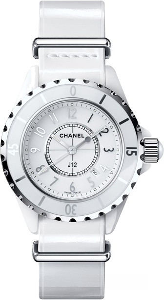 Часы J12-G10 Gloss H4656. Корпус из белой высокотехнологичной керамики и стали. Однонаправленный вращающийся безель. Завинчивающаяся заводная коронка. Белый ремешок из лакированной кожи теленка и белый ремешок из нейлона, стандартная застежка и петли из стали. Высокоточный кварцевый механизм. Водонепроницаемость 200 м. Диаметр 33 мм.