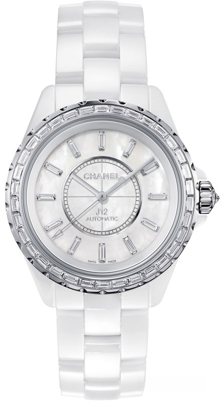 Часы Chanel J12 Jewellery выпущены в корпусе из белого золота 18к и керамики размером 38 мм с водонепроницаемостью 50 м. Внутри корпуса установлен автоматический механизм. Запас хода 42 часа. На белом жемчужном циферблате с 12-ю белыми багетными бриллиантами отображаются часы, минуты, секнуды. Часы комплектуются браслетом из из керамики. Безель из 34-х белых багетных бриллиантов.