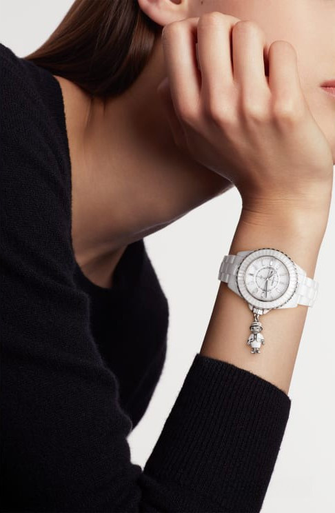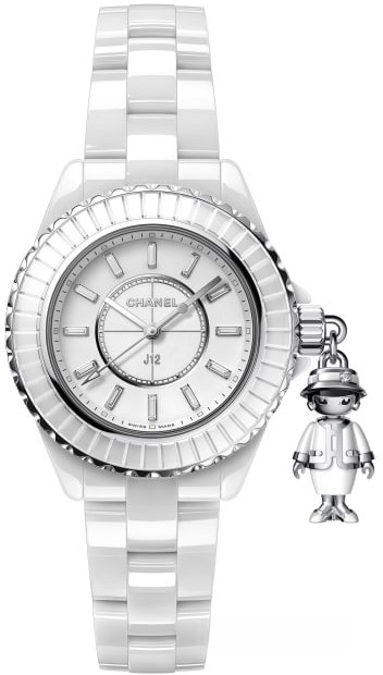 Часы Chanel J12 Mademoiselle представлены в корпусе из керамики размером 33 мм водонепроницаемостью 50 метров. Внутри корпуса находится кварцевый механизм. На белом циферблате с 12-ю белыми багетными бриллиантами отображаются часы, минуты, секунды. Часы поставляются на керамическом браслете. Серия ограничена - 555 шт.