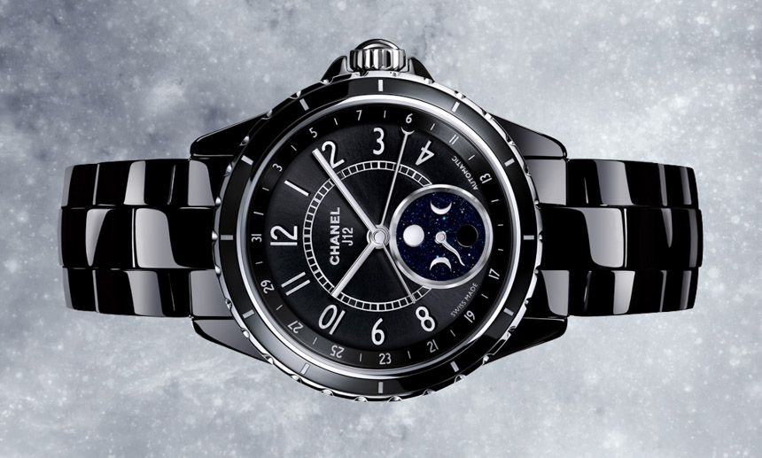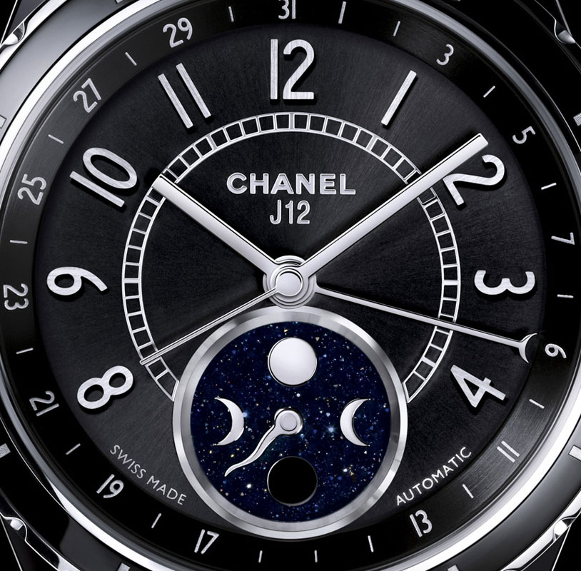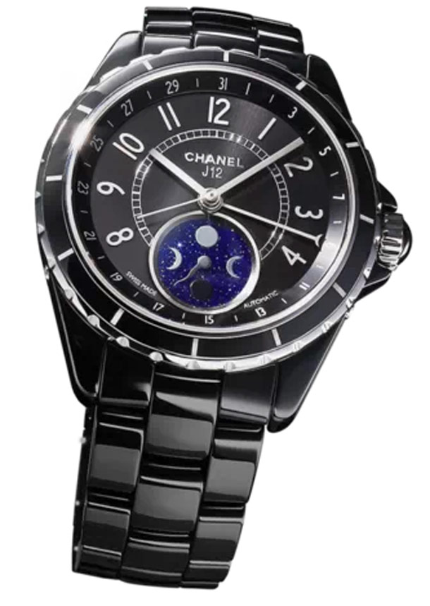 Часы Chanel J12 Moonphase выпущены в корпусе из керамики и нержавеющей стали размером 38 мм с водонепроницаемостью 100 м. Внутри корпуса установлен автоматический механизм. Запас хода 42 часа. На черном циферблате отображаются часы, минуты, секунды, дата, фаза луны. Часы комплектуются браслетом из керамики.