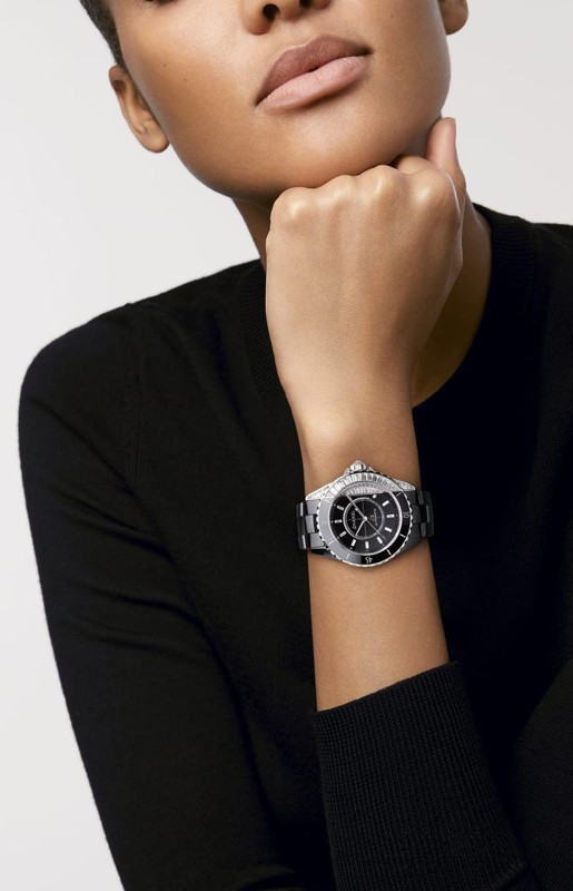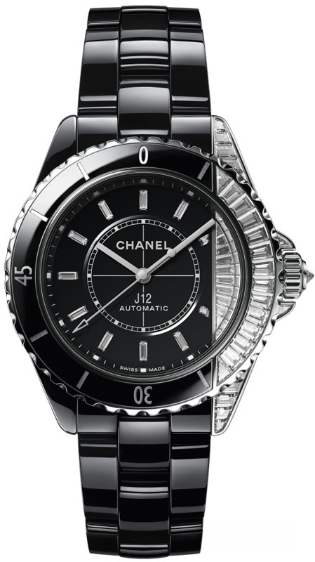 Часы Chanel J12 Paradoxe представлены в корпусе из керамики и белого золота 18к размером 38 х 12.76 мм водонепроницаемостью 50 метров. Внутри корпуса установлен автоматический механизм, Калибр 12.1, обладающий запасом хода 70 часов. На черном с белыми багетными бриллиантами циферблате отображаются часы, минуты, секунды. Часы поставляются на керамическом браслете. Корпус инкрустирован белыми багетными бриллиантами.