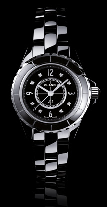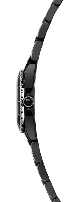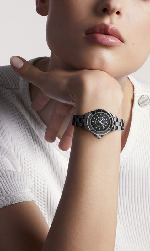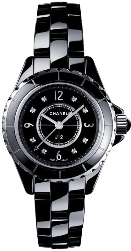 Часы Chanel J12 Quartz 29 mm выпущены в корпусе из керамики размером 29 мм с водонепроницаемостью 100 м. Внутри корпуса установлен кварцевый механизм. На черном циферблате с 8-ю белыми бриллиантами отображаются часы, минуты, секунды. Часы комплектуются браслетом из керамики.