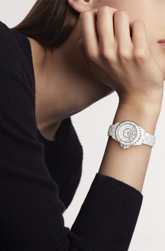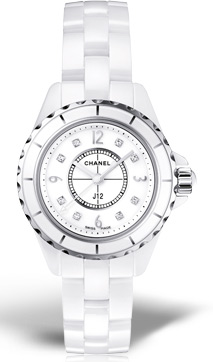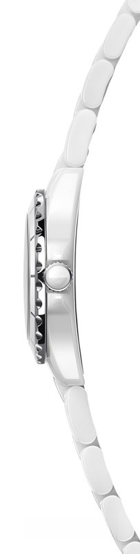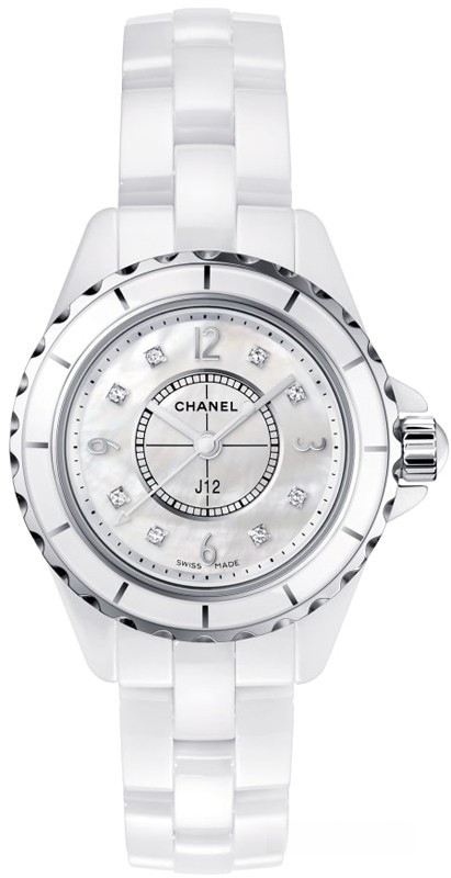 Часы Chanel J12 Quartz 29 mm выпущены в корпусе из керамики размером 29 мм с водонепроницаемостью 100 м. Внутри корпуса установлен кварцевый механизм. На белом жемчужном циферблате с 8-ю белыми бриллиантами отображаются часы, минуты, секунды. Часы комплектуются браслетом из керамики.