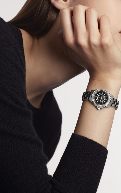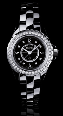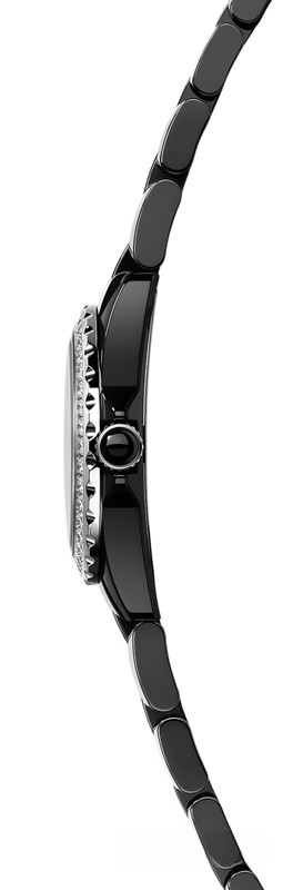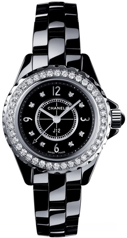 Часы Chanel J12 Quartz 29 mm выпущены в корпусе из керамики размером 29 мм с водонепроницаемостью 100 м. Внутри корпуса установлен кварцевый механизм. На черном циферблате с 8-ю белыми бриллиантами отображаются часы, минуты, секунды. Часы комплектуются браслетом из керамики. Безель из белых бриллиантов.