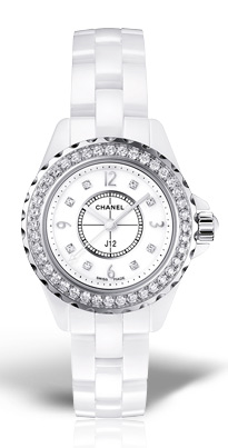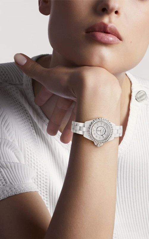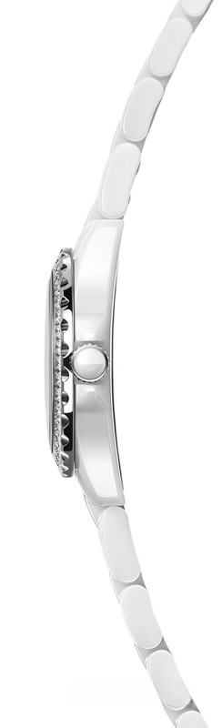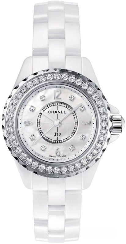 Часы Chanel J12 Quartz 29 mm выпущены в корпусе из керамики размером 29 мм с водонепроницаемостью 100 м. Внутри корпуса установлен кварцевый механизм. На белом жемчужном циферблате с 8-ю белыми бриллиантами отображаются часы, минуты, секунды. Часы комплектуются браслетом из керамики. Безель из белых бриллиантов.