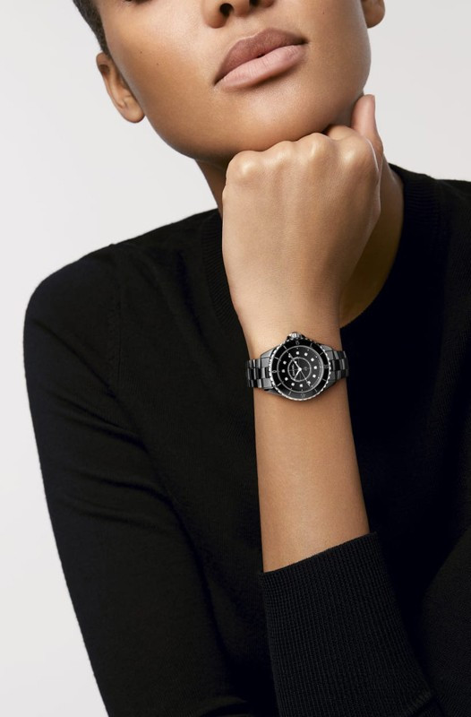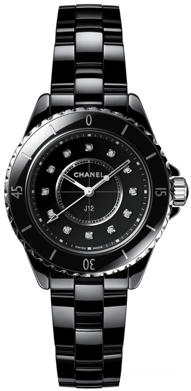 Часы Chanel J12 представлены в корпусе из керамики размером 33 мм водонепроницаемостью 200 метров. Внутри корпуса установлен кварцевый механизм. На черном циферблате с 12-ю белыми бриллиантами отображаются часы, минуты, секунды. Часы поставляются на керамическом браслете.
