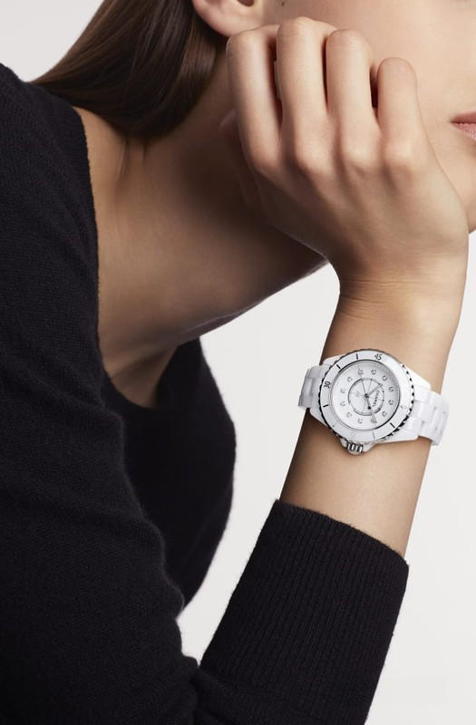 Часы Chanel J12 представлены в корпусе из керамики размером 33 мм водонепроницаемостью 200 метров. Внутри корпуса установлен кварцевый механизм. На белом циферблате с 12-ю белыми бриллиантами отображаются часы, минуты, секунды. Часы поставляются на керамическом браслете.