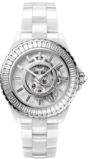 Часы Chanel J12 X-Ray представлены в корпусе из керамики размером 38 мм водонепроницаемостью 30 метров. Внутри корпуса находится механизм с ручным заводом, обладающий запасом хода 55 часов. На скелетированном циферблате отображаются часы, минуты. Часы поставляются на керамическом браслете. Безель из белых багетных бриллиантов.