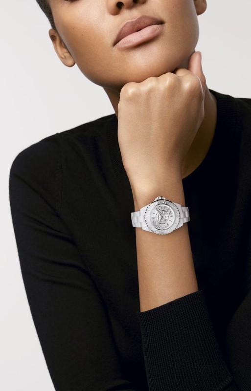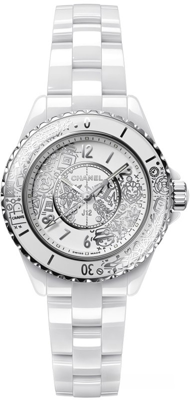 Часы Chanel J12.20 представлены в корпусе из нержавеющей стали и керамики размером 33 мм водонепроницаемостью 200 метров. Внутри корпуса установлен кварцевый механизм. На белом циферблате с 12-ю белыми бриллиантами отображаются часы, минуты, секунды. Часы поставляются на керамическом браслете. Серия ограничена - 2020 шт.