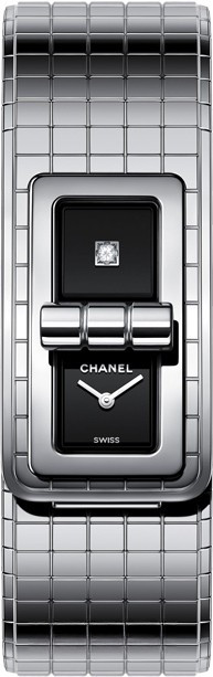 Часы Chanel Code Coco представлены в корпусе из нержавеющей стали размером 38.1 x 21.5 мм и водонепроницаемостью 30 метров. Внутри корпуса установлен кварцевый механизм. На черном циферблате с 1 белым бриллиантом отображаются часы, минуты. Часы поставляются браслете из нержавеющей стали.