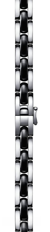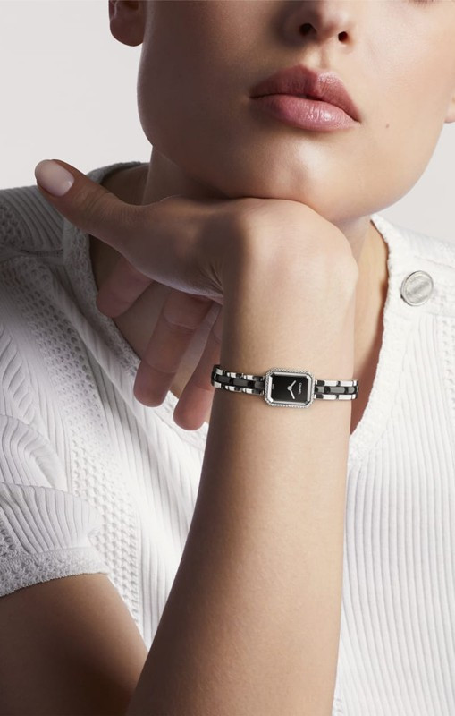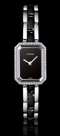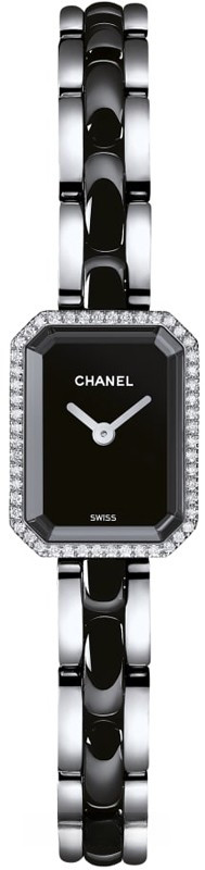 Часы Chanel Les Intemporelles de Chanel Premiere выпущены в корпусе из нержавеющей стали размером 19.7 х 15.2 х 7.8 мм с водонепроницаемостью 30 м. Внутри корпуса установлен кварцвый механизм. На черном циферблате отображаются часы, минуты. Часы комплектуются браслетом из керамики и нержавеющей стали. Безель из белых бриллиантов.